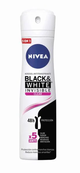Nivea Invisible for Black&White, El antitranspirante desarollado con expertos textiles te ofrece una protección antitranspirante sin riesgo de dejar manchas blancas en ropa negra y reduce la formación de manchas amarillas en ropa blanca.