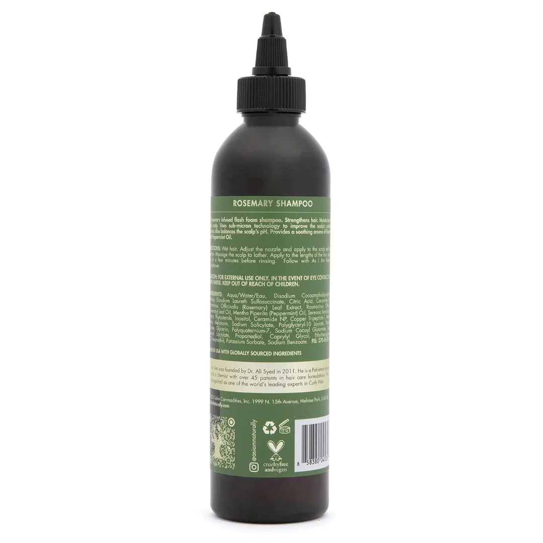 Modo de Uso: Humedece el cabello, ajusta la boquilla y aplica el champú sección por sección en el cuero cabelludo. Masajea suavemente para crear espuma y distribúyelo por toda la longitud del cabello. Deja actuar unos minutos antes de aclarar y, a continuación, utiliza el acondicionador As I Am Rosemary para resultados óptimos.