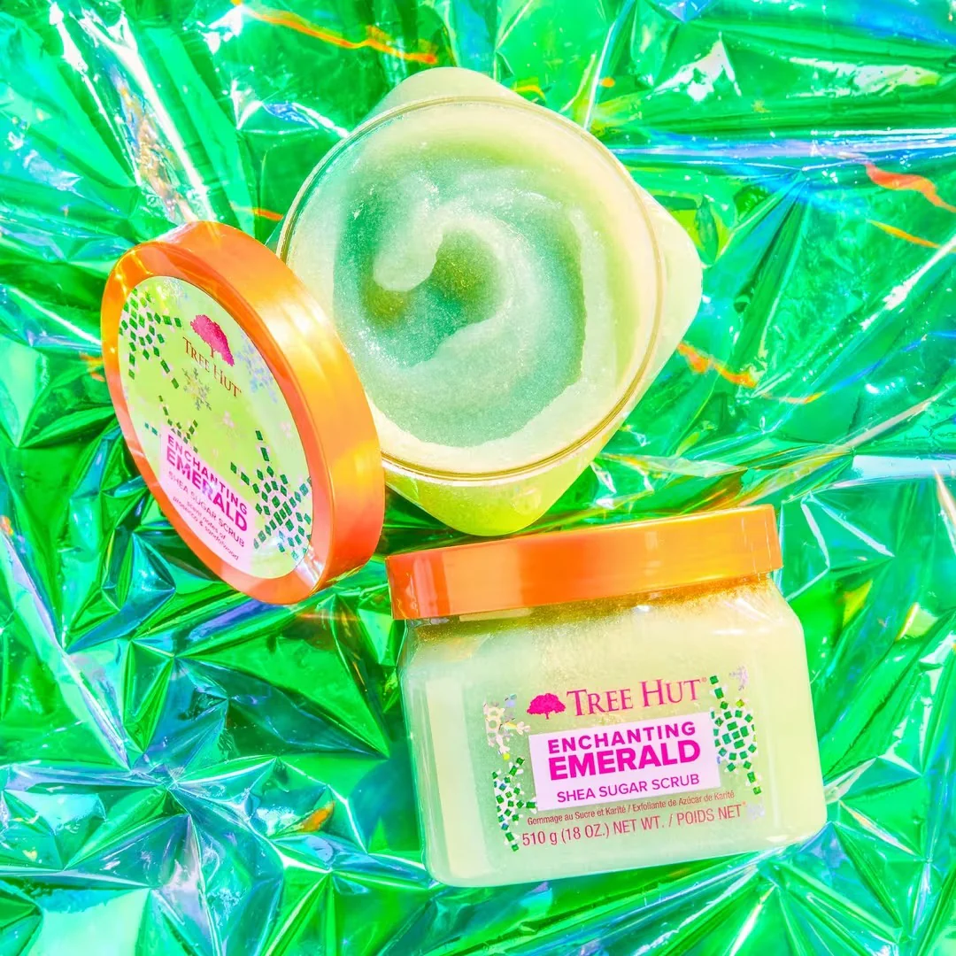Defenicion ¡Revele una piel vibrante con el aroma efervescente de Enchanting Emerald! Elaborado con azúcar y manteca de karité para dejar la piel nutrida y suave. Los exfoliantes con azúcar de Tree Hut eliminan la piel opaca y muerta con una exfoliación suave y tienen una fórmula antideslizante con una fragancia duradera.